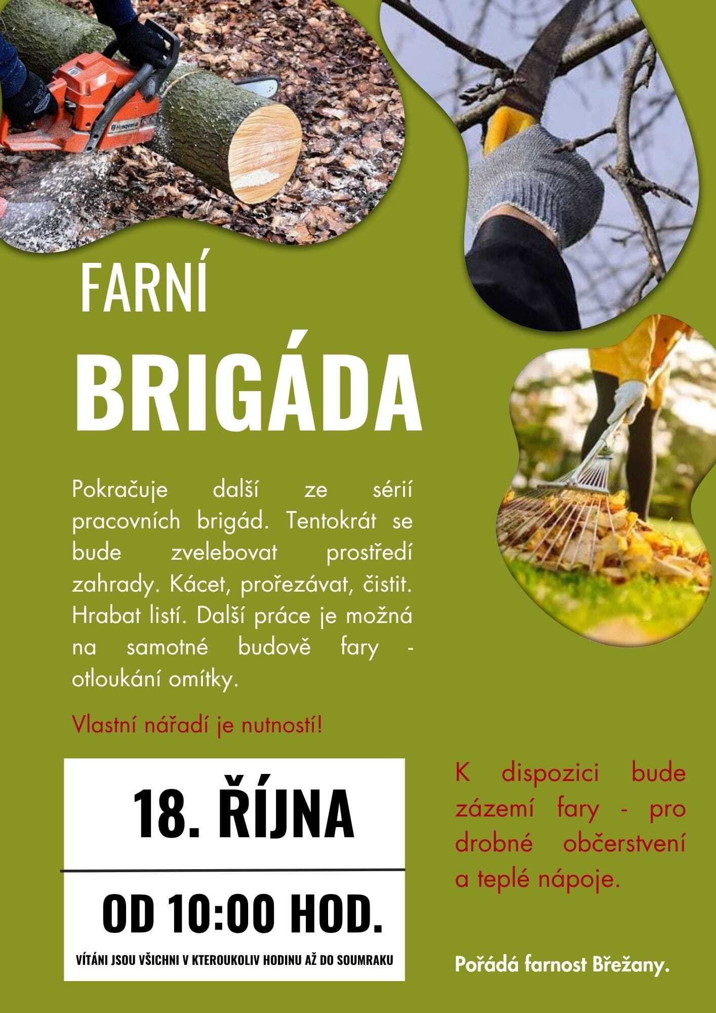 Pokračuje další ze sérií pracovních brigád. Tentokrát se bude zvelebovat prostředí zahrady. Vlastní nářadí s sebou. Kácet, prořezávat, čistit... v sobotu 18. října od 10:00 hodin. Vítáni jsou všichni v kteroukoli hodinu až do soumraku.