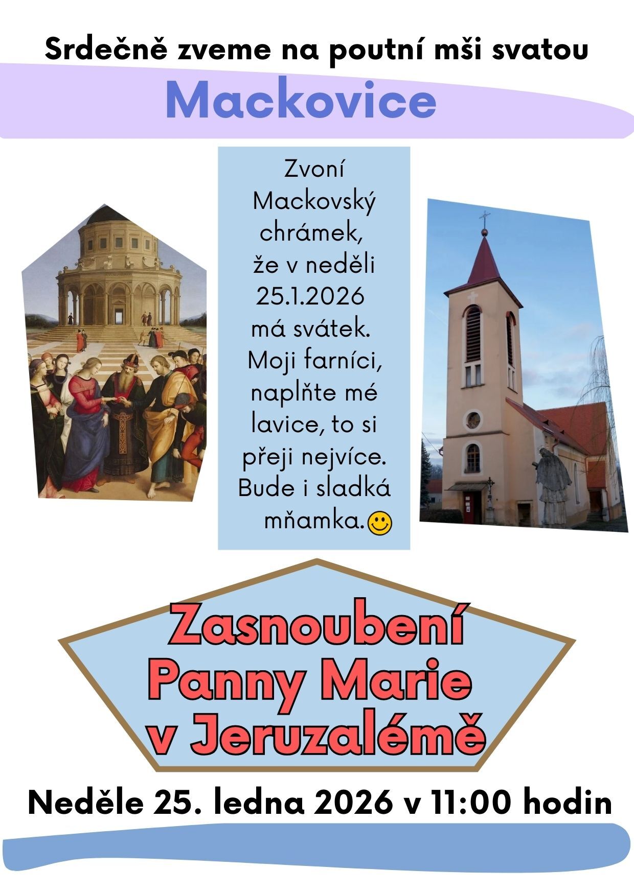 Srdečně zveme na poutní mši svatou v Mackovicích u příležitosti svátku Zasnoubení Panny Marie v Jeruzalémě. V něděli 25.1.2026 v 11:00 h.